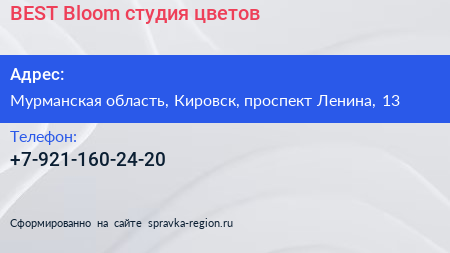 BEST-Bloom, студия цветов по адресу Мурманская область, Кировск, проспект Ленина, 13 в дальнейшем Организация, размещена в следующих категориях: