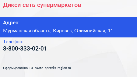 Дикси, сеть супермаркетов по адресу Мурманская область, Кировск, Олимпийская, 11 в дальнейшем Организация, размещена в следующих категориях: