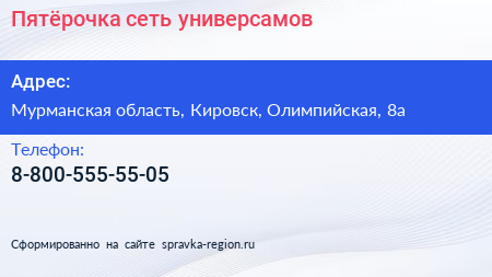 Пятёрочка, сеть универсамов по адресу Мурманская область, Кировск, Олимпийская, 8а в дальнейшем Организация, размещена в следующих категориях: