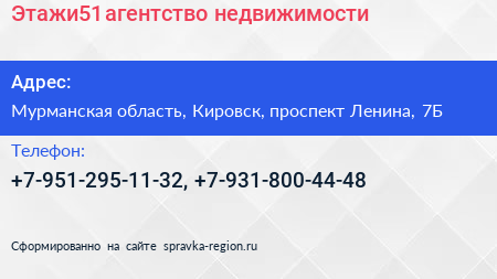 Этажи51, агентство недвижимости по адресу Мурманская область, Кировск, проспект Ленина, 7Б в дальнейшем Организация, размещена в следующих категориях: