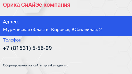 Орика СиАйЭс, компания по адресу Мурманская область, Кировск, Юбилейная, 2 в дальнейшем Организация, размещена в следующих категориях: