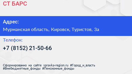 СТ-БАРС по адресу Мурманская область, Кировск, Туристов, 3а в дальнейшем Организация, размещена в следующих категориях: