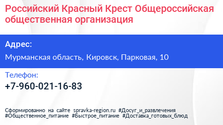 Российский Красный Крест, Общероссийская общественная организация по адресу Мурманская область, Кировск, Парковая, 10 в дальнейшем Организация, размещена в следующих категориях: