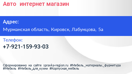 Авто+, интернет-магазин по адресу Мурманская область, Кировск, Лабунцова, 5а в дальнейшем Организация, размещена в следующих категориях: