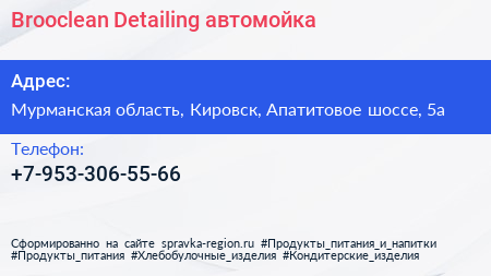 Brooclean Detailing, автомойка по адресу Мурманская область, Кировск, Апатитовое шоссе, 5а в дальнейшем Организация, размещена в следующих категориях: