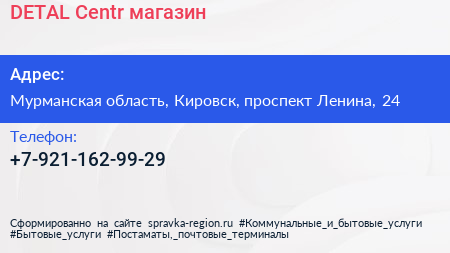 DETAL Centr, магазин по адресу Мурманская область, Кировск, проспект Ленина, 24 в дальнейшем Организация, размещена в следующих категориях: