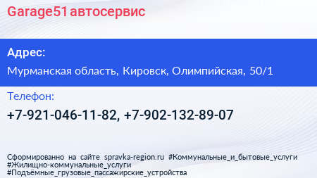 Garage51, автосервис по адресу Мурманская область, Кировск, Олимпийская, 50/1 в дальнейшем Организация, размещена в следующих категориях: