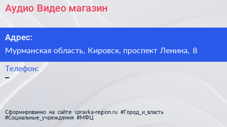 Аудио-Видео, магазин по адресу Мурманская область, Кировск, проспект Ленина, 8 в дальнейшем Организация, размещена в следующих категориях: