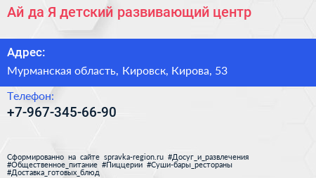 Ай, да, Я!, детский развивающий центр по адресу Мурманская область, Кировск, Кирова, 53 в дальнейшем Организация, размещена в следующих категориях: