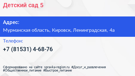 Детский сад №5 по адресу Мурманская область, Кировск, Ленинградская, 4а в дальнейшем Организация, размещена в следующих категориях: