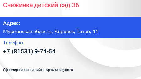Снежинка, детский сад №36 по адресу Мурманская область, Кировск, Титан, 11 в дальнейшем Организация, размещена в следующих категориях:
