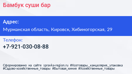Бамбук, суши-бар по адресу Мурманская область, Кировск, Хибиногорская, 29 в дальнейшем Организация, размещена в следующих категориях: