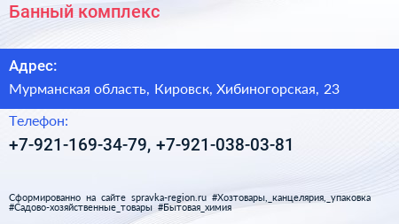 Банный комплекс по адресу Мурманская область, Кировск, Хибиногорская, 23 в дальнейшем Организация, размещена в следующих категориях: