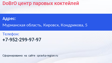 DoBrO, центр паровых коктейлей по адресу Мурманская область, Кировск, Кондрикова, 5 в дальнейшем Организация, размещена в следующих категориях: