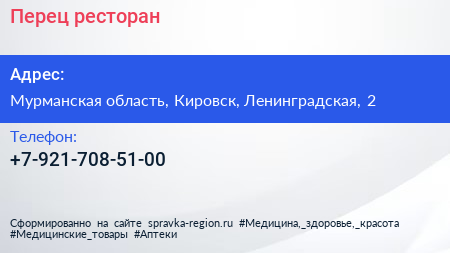 Перец, ресторан по адресу Мурманская область, Кировск, Ленинградская, 2 в дальнейшем Организация, размещена в следующих категориях: