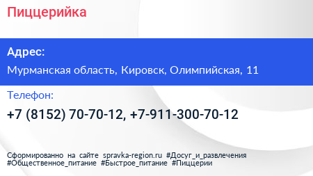 Пиццерийка по адресу Мурманская область, Кировск, Олимпийская, 11 в дальнейшем Организация, размещена в следующих категориях: