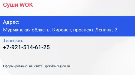 Суши WOK по адресу Мурманская область, Кировск, проспект Ленина, 7 в дальнейшем Организация, размещена в следующих категориях: