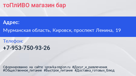 тоПлИВО, магазин-бар по адресу Мурманская область, Кировск, проспект Ленина, 19 в дальнейшем Организация, размещена в следующих категориях: