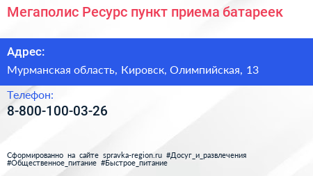 Мегаполис Ресурс, пункт приема батареек по адресу Мурманская область, Кировск, Олимпийская, 13 в дальнейшем Организация, размещена в следующих категориях: