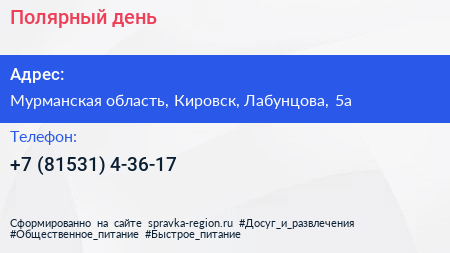 Полярный день по адресу Мурманская область, Кировск, Лабунцова, 5а в дальнейшем Организация, размещена в следующих категориях: