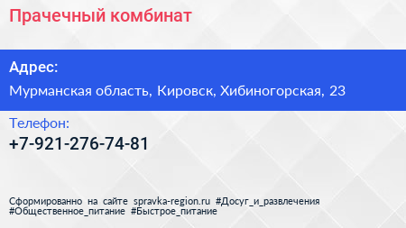 Прачечный комбинат по адресу Мурманская область, Кировск, Хибиногорская, 23 в дальнейшем Организация, размещена в следующих категориях: