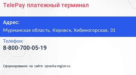 TelePay, платежный терминал по адресу Мурманская область, Кировск, Хибиногорская, 31 в дальнейшем Организация, размещена в следующих категориях: