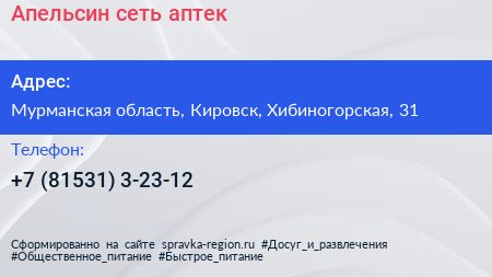 Апельсин, сеть аптек по адресу Мурманская область, Кировск, Хибиногорская, 31 в дальнейшем Организация, размещена в следующих категориях: