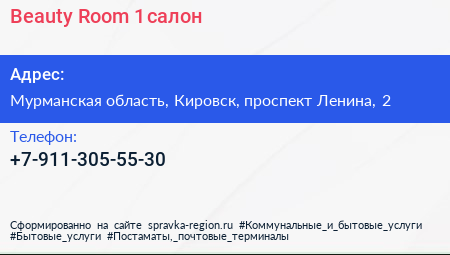 Beauty Room №1, салон по адресу Мурманская область, Кировск, проспект Ленина, 2 в дальнейшем Организация, размещена в следующих категориях: