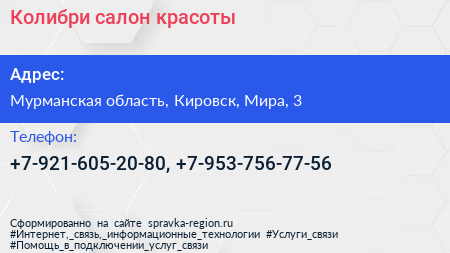Колибри, салон красоты по адресу Мурманская область, Кировск, Мира, 3 в дальнейшем Организация, размещена в следующих категориях: