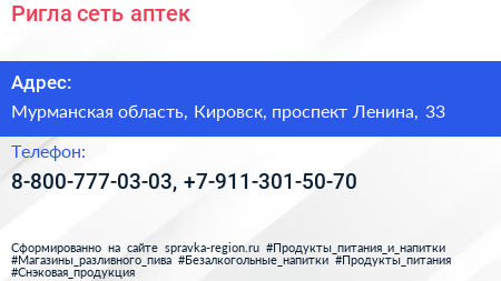 Ригла, сеть аптек по адресу Мурманская область, Кировск, проспект Ленина, 33 в дальнейшем Организация, размещена в следующих категориях: