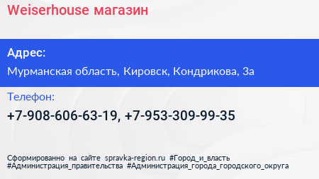 Weiserhouse, магазин по адресу Мурманская область, Кировск, Кондрикова, 3а в дальнейшем Организация, размещена в следующих категориях: