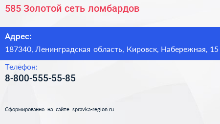 585*Золотой, сеть ломбардов по адресу 187340, Ленинградская область, Кировск, Набережная, 15 в дальнейшем Организация, размещена в следующих категориях: