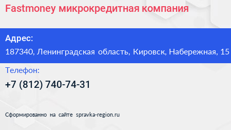 Fastmoney, микрокредитная компания по адресу 187340, Ленинградская область, Кировск, Набережная, 15 в дальнейшем Организация, размещена в следующих категориях: