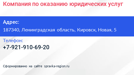 Компания по оказанию юридических услуг по адресу 187340, Ленинградская область, Кировск, Новая, 5 в дальнейшем Организация, размещена в следующих категориях: