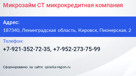 Микрозайм-СТ, микрокредитная компания по адресу 187340, Ленинградская область, Кировск, Пионерская, 2 в дальнейшем Организация, размещена в следующих категориях: