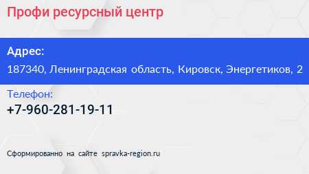 Профи, ресурсный центр по адресу 187340, Ленинградская область, Кировск, Энергетиков, 2 в дальнейшем Организация, размещена в следующих категориях: