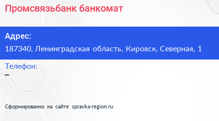 Промсвязьбанк, банкомат по адресу 187340, Ленинградская область, Кировск, Северная, 1 в дальнейшем Организация, размещена в следующих категориях:
