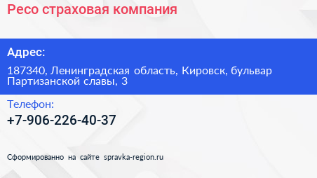 Ресо, страховая компания по адресу 187340, Ленинградская область, Кировск, бульвар Партизанской славы, 3 в дальнейшем Организация, размещена в следующих категориях:
