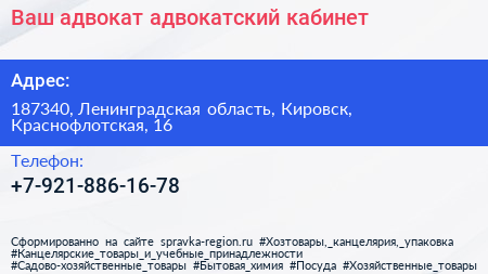 Ваш адвокат, адвокатский кабинет по адресу 187340, Ленинградская область, Кировск, Краснофлотская, 16 в дальнейшем Организация, размещена в следующих категориях: