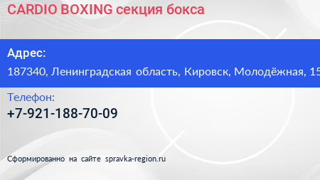 CARDIO-BOXING, секция бокса по адресу 187340, Ленинградская область, Кировск, Молодёжная, 15 в дальнейшем Организация, размещена в следующих категориях:
