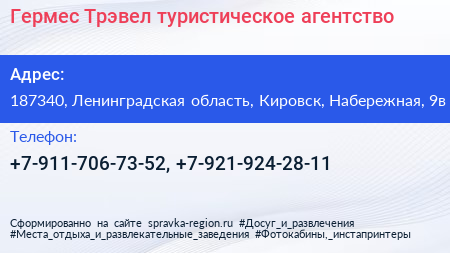 Гермес Трэвел, туристическое агентство по адресу 187340, Ленинградская область, Кировск, Набережная, 9в в дальнейшем Организация, размещена в следующих категориях: