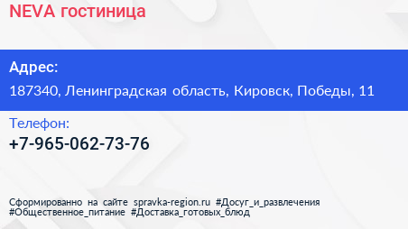 NEVA, гостиница по адресу 187340, Ленинградская область, Кировск, Победы, 11 в дальнейшем Организация, размещена в следующих категориях: