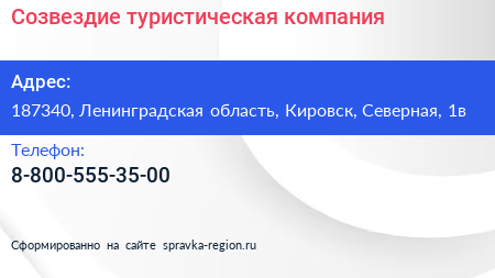 Созвездие, туристическая компания по адресу 187340, Ленинградская область, Кировск, Северная, 1в в дальнейшем Организация, размещена в следующих категориях: