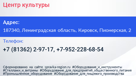 Центр культуры по адресу 187340, Ленинградская область, Кировск, Пионерская, 2 в дальнейшем Организация, размещена в следующих категориях: