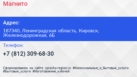 Магнито по адресу 187340, Ленинградская область, Кировск, Железнодорожная, 6Б в дальнейшем Организация, размещена в следующих категориях: