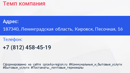Темп, компания по адресу 187340, Ленинградская область, Кировск, Песочная, 16 в дальнейшем Организация, размещена в следующих категориях: