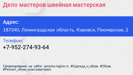 Дело мастеров, швейная мастерская по адресу 187340, Ленинградская область, Кировск, Пионерская, 2 в дальнейшем Организация, размещена в следующих категориях: