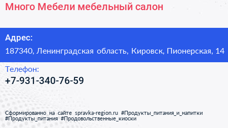 Много Мебели, мебельный салон по адресу 187340, Ленинградская область, Кировск, Пионерская, 14 в дальнейшем Организация, размещена в следующих категориях: