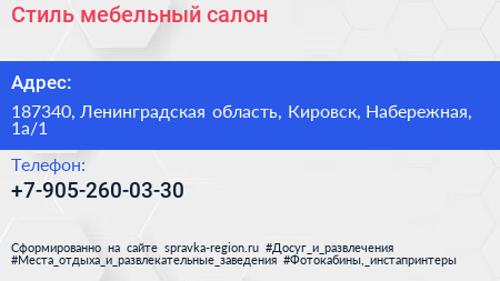 Стиль, мебельный салон по адресу 187340, Ленинградская область, Кировск, Набережная, 1а/1 в дальнейшем Организация, размещена в следующих категориях: