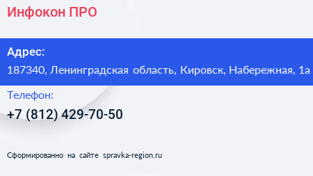 Инфокон ПРО по адресу 187340, Ленинградская область, Кировск, Набережная, 1а в дальнейшем Организация, размещена в следующих категориях: